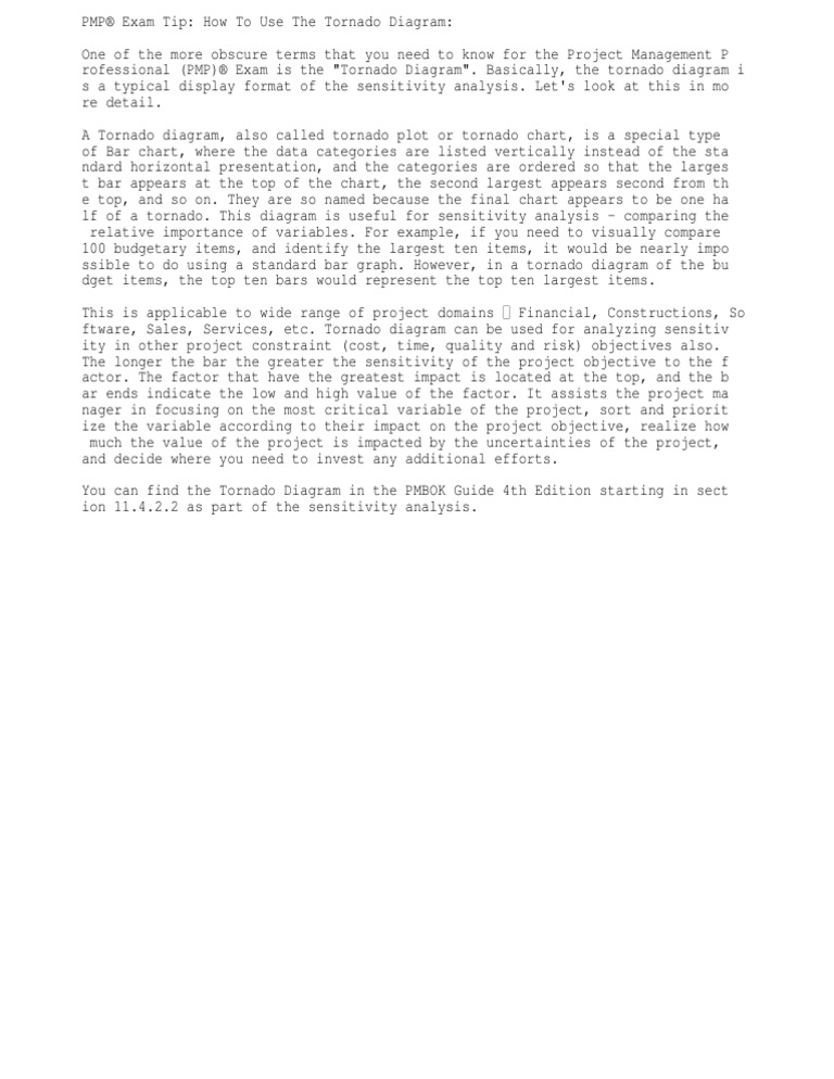 A tornado diagram is a sensitivity analysis tool. The name 'tornado' diagram comes from. You and your team are currently creating a tornado diagram for the project risks. The organizations compared during benchmarking can be internal or external. Tornado diagram one of the more obscure terms that you need to know for the project management professional (pmp)® exam is the tornado diagram. It is meant to give you, the analyst, an idea of which factors are most important to the decision/risk problem at hand. (diagram, that is) about six months ago, we received word from one of our pmp prep students that he had a strange weather topic appear on his pmp exam, something like a hurricane chart or something. This technique is used during the perform quantitative risk analysis process. One of the more obscure terms that you need to know for the project management professional (pmp) exam is the tornado diagram. A tornado chart can be produced by pressing the tornado chart… button in the sensitivity analysis dialog. This is where tornado diagram comes in handy. Tornado diagram of the sensitivity analysis, pmbok page 434 It can also be useful as part of the analytical project's results, giving the decision makers some insight into the.